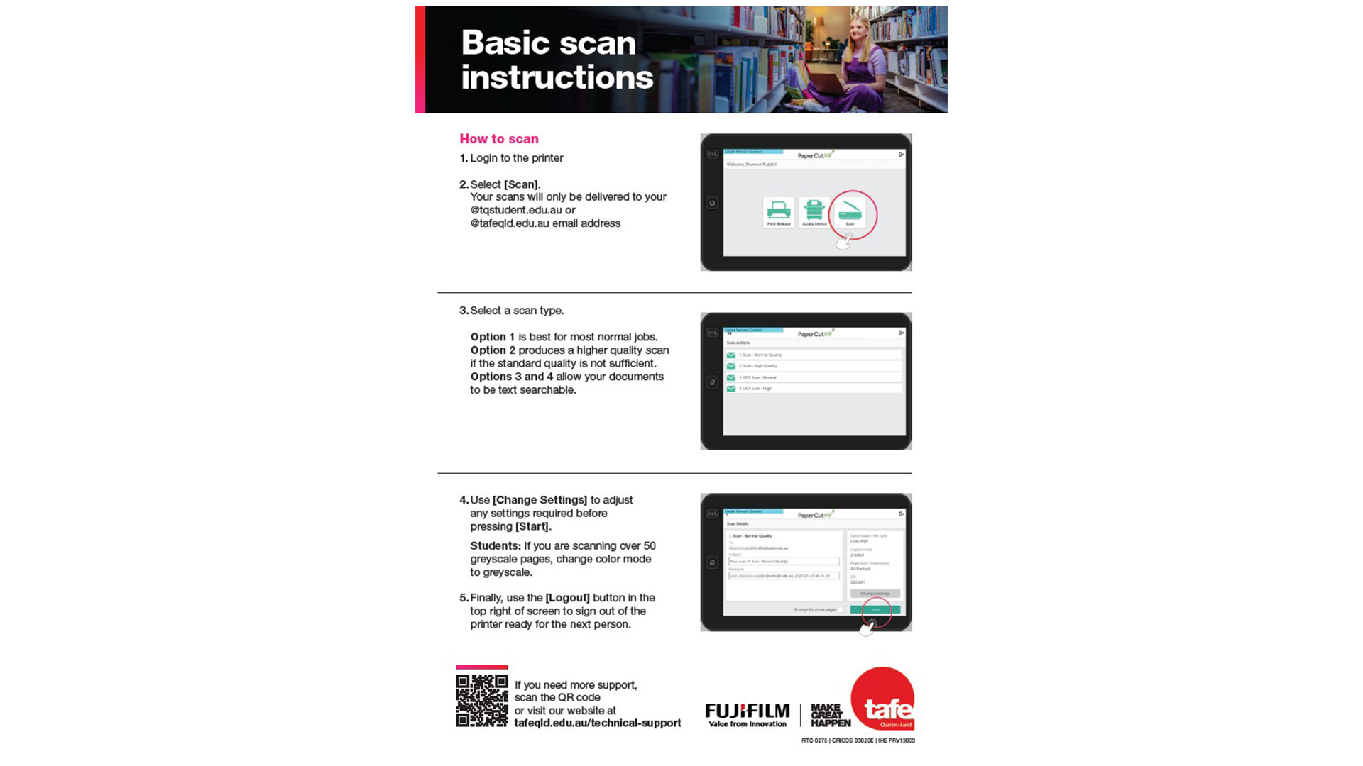 You can access your PaperCut account on a TAFE Queensland device, such as the computers available for student use in our libraries. If you require assistance, please engage one of our staff members in your campus library.