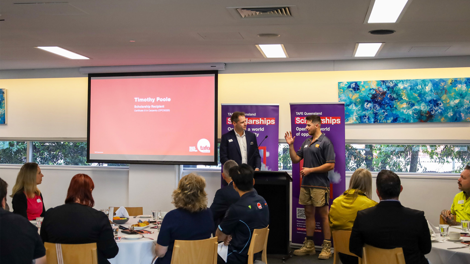 The breakfast celebrated students undertaking a wide range of study areas, including carpentry, air conditioning and refrigeration, visual arts and project management, showcasing the breadth of opportunities supported through the scholarship program.